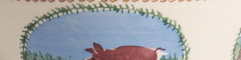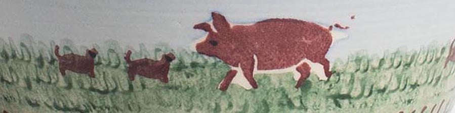 Handcrafted ceramic small-angled bowl, designed for a variety of occasions and uses. These uniquely angled pottery bowls are finished with the hand-sponged pig print, against a vibrant blue and green landscape, encircled in a green leaf border. Founded in 1976 by Nicholas Mosse and his wife Susan, Nicholas Mosse is known for producing handmade, functional pottery in the style of Irish Spongeware, characterized by simple shapes and patterns inspired by Irish landscapes and nature.