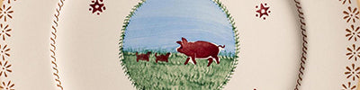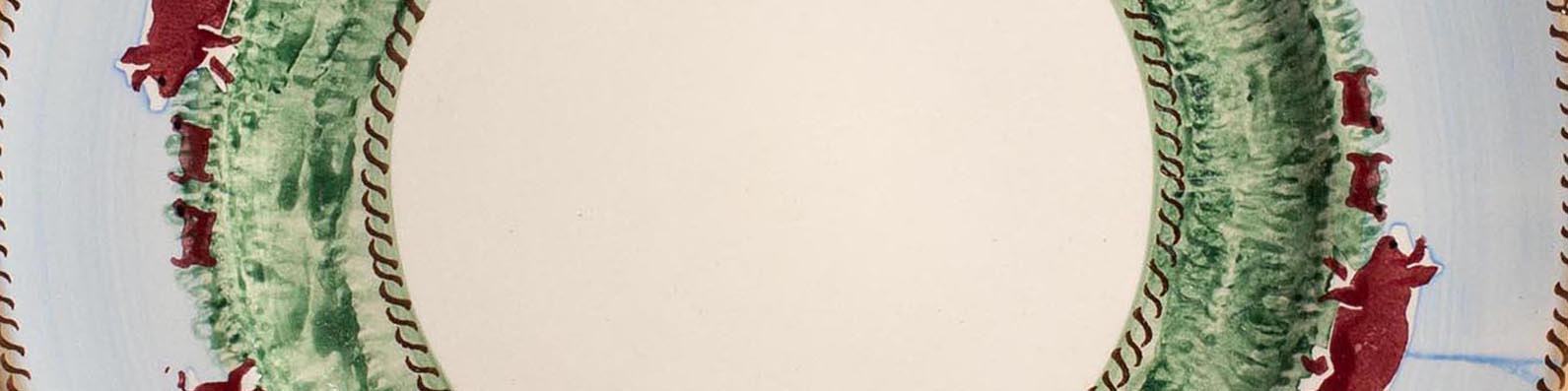 Handcrafted ceramic plate, designed for serving. Each unique durable pottery plate is finished with the hand-sponged pig print, beset against a vibrant blue and green landscape, encircled in a green leaf border. Founded in 1976 by Nicholas Mosse and his wife Susan, Nicholas Mosse is known for producing handmade, functional pottery in the style of Irish Spongeware, characterized by simple shapes and patterns inspired by Irish landscapes and nature.